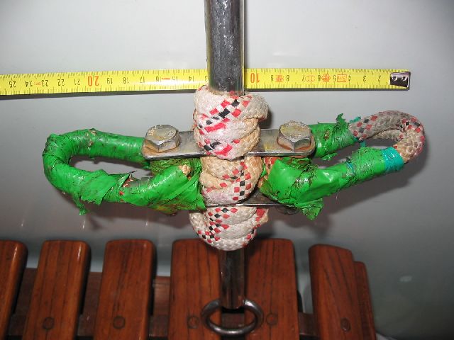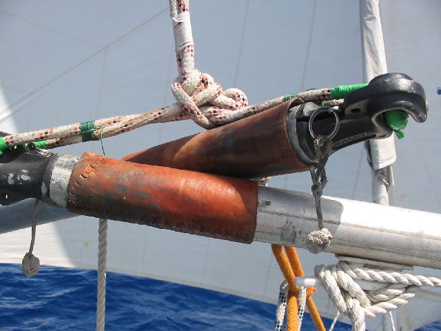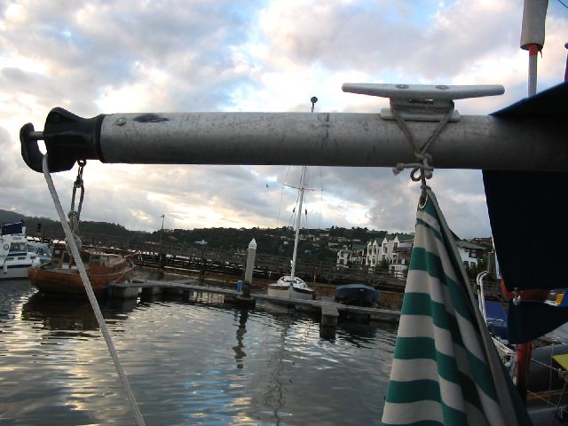 Here the poles are doing their second essential job of supporting the awning in harbour. Life in the tropics is a lot easier with a good awning and side screens. The chafe mark from the stainless universal joint v1.1 can be seen near the end fitting. The original poles were found to be too short but another, longer, end section was slid inside the centre section and pop riveted home. A simple job. The poles are stowed on the side decks with the fore end fitting clipped to the base of a stanchion. Width and curvature of the side decks govern the length of the poles. |