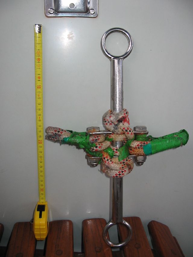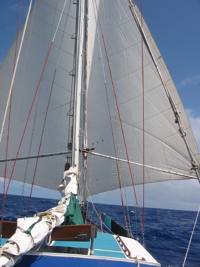 The tack of the twizzle jibs was initially made off to the furling drum with a short lanyard. As there was plenty of room left at the head of the foil a strop was added below the tack which raised the twizzle jibs about 600mm / 2ft. This made a marked improvement in forward visibility with no bad side effects. Even with this height of clew, severe rolls dipped the clew into the seas. The ability of the pole to swing over prevented damage from the immersion. The mizzen was set all the time and a mizzen staysail used in broad reach winds below about 20 knots and during daylight hours. |